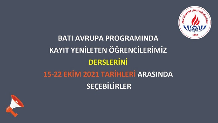 Batı Avrupa Programında Kayıt Yenileten Öğrencileri Ders Seçimlerini 15-22 Ekim 2021 Tarihleri Arasında Yapabilirler