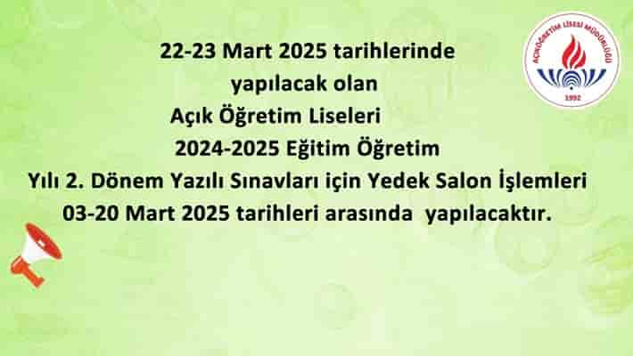 22-23 Mart 2025 tarihlerinde yapılacak olan Açık Öğretim Liseleri 2024-2025 Eğitim Öğretim Yılı 2. Dönem Yazılı Sınavları Yedek Salon İşlemleri