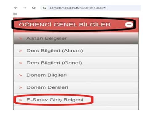 e-Sınav için 27 Mayıs – 11 Haziran 2025 tarihleri arasında randevu alan öğrenciler, https://aolweb.meb.gov.tr/ogrenci_giris.aspx resmî internet adresinden öğrenci/T.C. Kimlik Numarası ile veya aynı ekrandaki e-devlet giriş ekranından şifrelerini kullanarak sisteme giriş yaptıktan sonra “Öğrenci Genel Bilgileri” sekmesi altında bulunan “e-Sınav Giriş Belgesi” ekranından “Sınav Bilgilerini Yazdır” butonundan fotoğraflı e-Sınav giriş belgelerini 23 Haziran 2025 tarihinden sınav tarihine kadar alabilecektir.