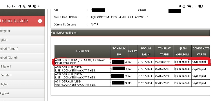 23-24 Ağustos tarihlerinde kayıt ücretini yatıran öğrenciler, kayıt yapıldı bilgisini görmek için Sisteme girip Öğrenci Genel Bilgileri altından Ücret Bilgisi sekmesini tıkladıklarında resimdeki kırmızı çerçeveye aldığımız satıra bakabilirler: