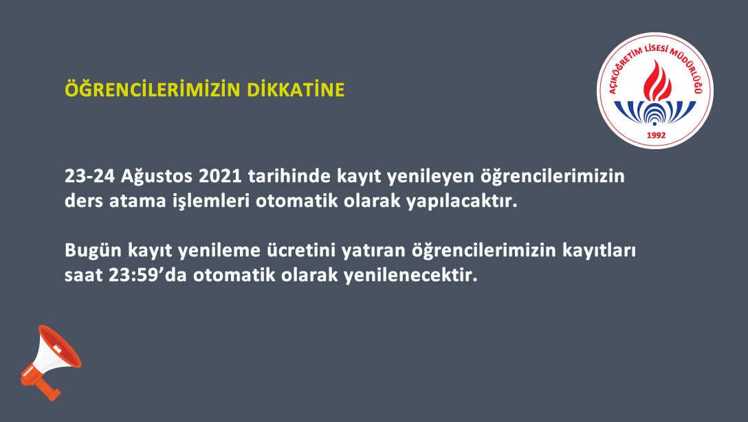 Bugün kayıt yenileme ücretini yatıran öğrencilerimizin kayıtları saat 23:59’da otomatik olarak yenilenecektir.